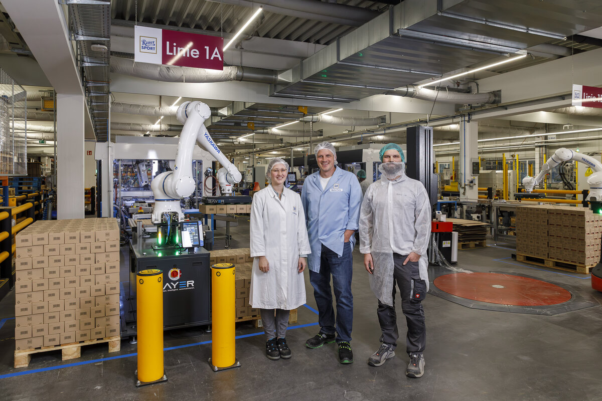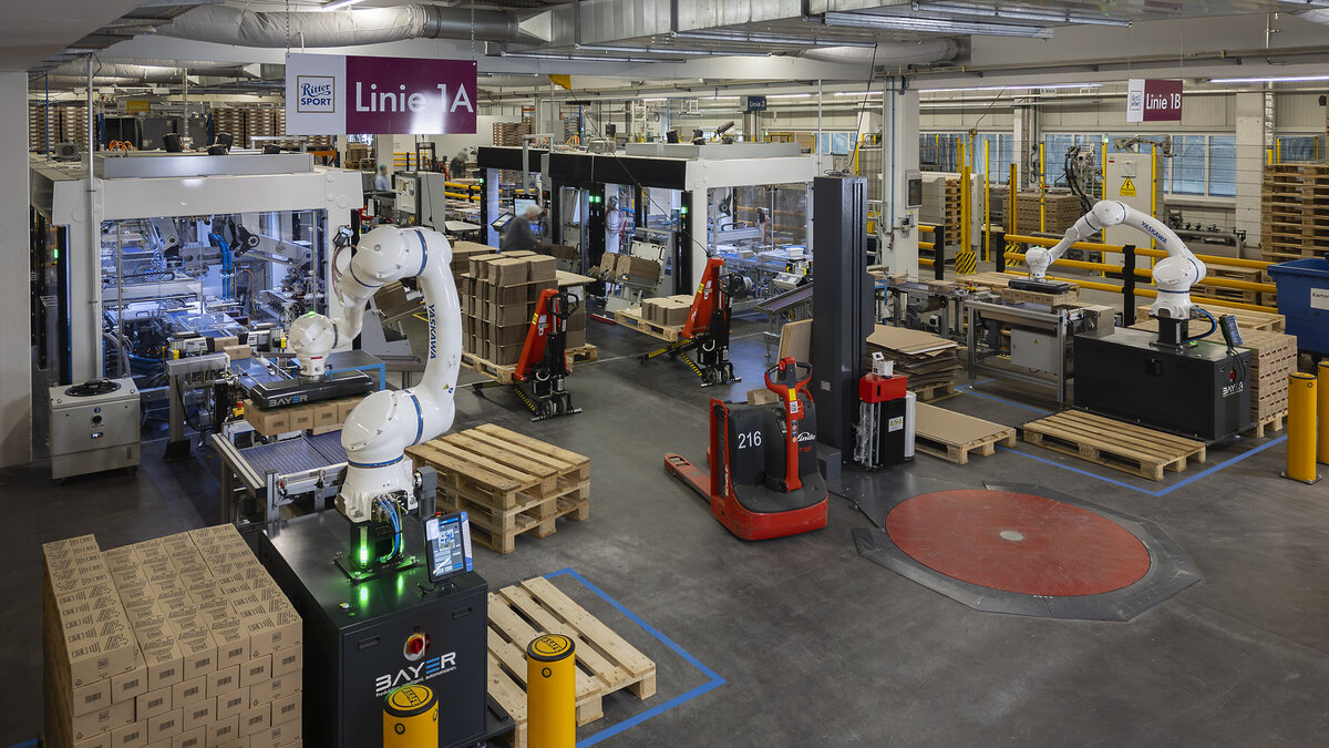 Palettiersysteme von Bayer mit Yaskawa Cobots für Ritter Sport Schokolade