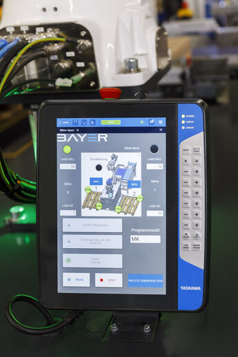 Für das entsprechende Steuergerät, das „Smart Pendant“, hat Bayer eigens ein anlagenspezifisches User-Interface programmiert. Auch Logistik-Mitarbeiter ohne automationstechnischen Hintergrund finden sich damit nun leicht in der Bedienung der Anlagen zurecht.